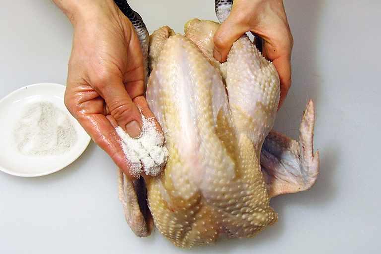<5>天然塩を手にとって、地鶏全体をまんべんなく刷り込みます。